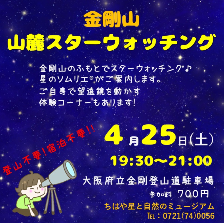 4月25日に大阪府立金剛登山道駐車場で金剛山山麓スターウォッチングを開催します。19:30~21:00までで参加料は700円です。星のソムリエがご案内するスターウォッチングで今の夜空に何の星が輝いているのかがすぐにわかります。さらに望遠鏡を動かす体験コーナーもあります。