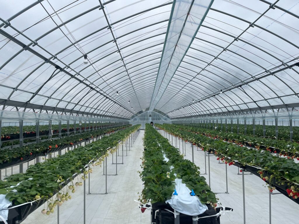 こちらは河南町にあるいちご農場です。こちらで栽培されたいちごがキックスの横にある直売所で、シーズン中にイチゴが直売されますが、今回は3周年ということでミニマルシェが行われます。