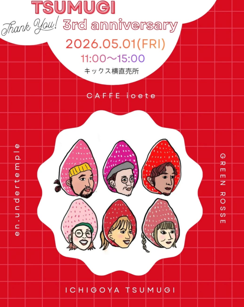 キックス横つむぎ直売所で5月1日に3周年を迎えた、苺屋つむぎさんのイベントが行われます。