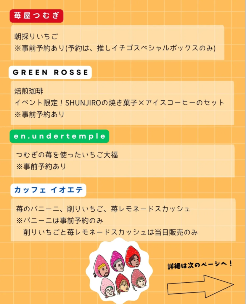 出店はいちご頭の6人衆ということで人気店が揃っています。お店は4店です。人気の商品ばかりなので事前予約も行っているそうで、申し込みは各instagramのDMで受け付けているとのこと。